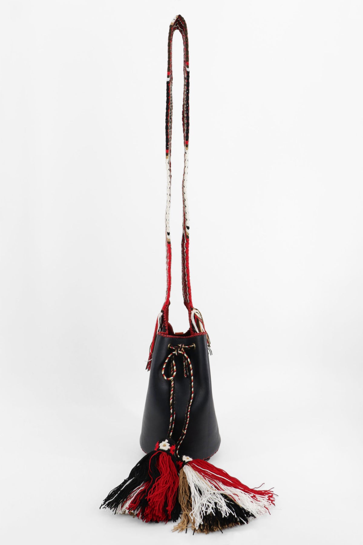 Small bucket bag, hand knitted long shoulder/cross-body strap, premium leather exterior, exquisite suede interior lining, braided cord-tie closure with thick...