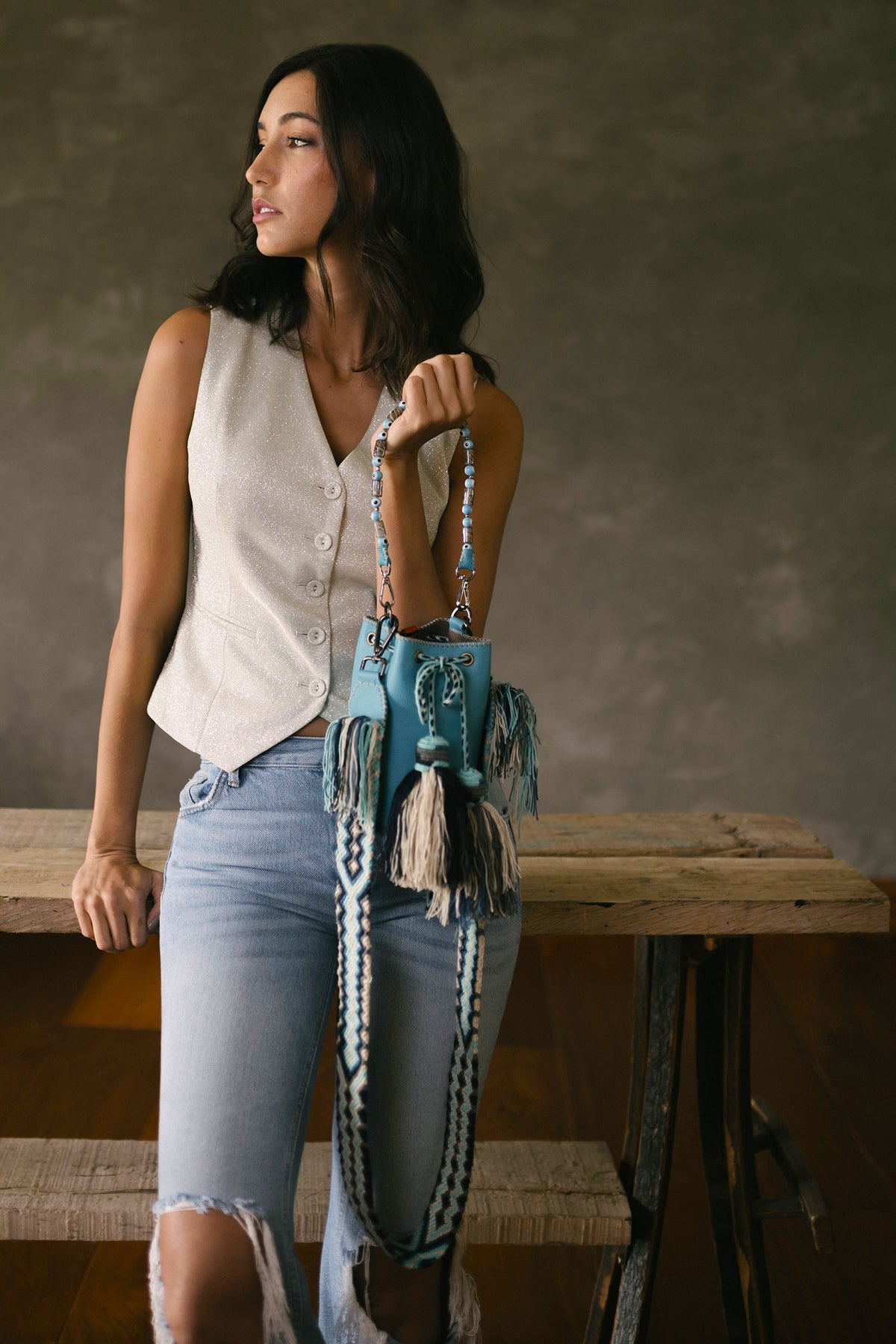 X-Small Bucket Bag, Dual Strap model with a short beaded strap plus a long hand knitted crossbody-shoulder strap, premium cowhide...