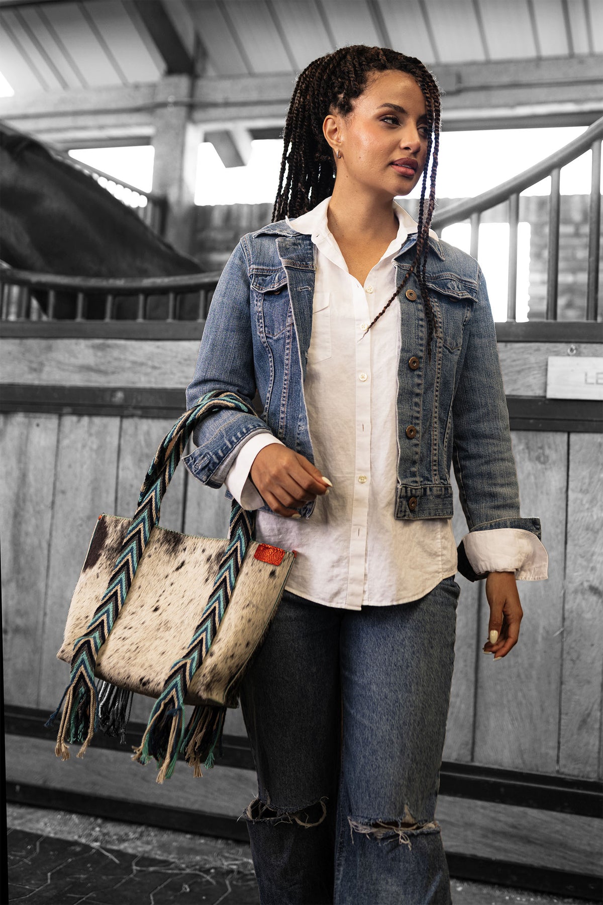 PIAMA TOTE BAG MEDIUM FURRY / WH&BLK - TURQUOISE #190007
