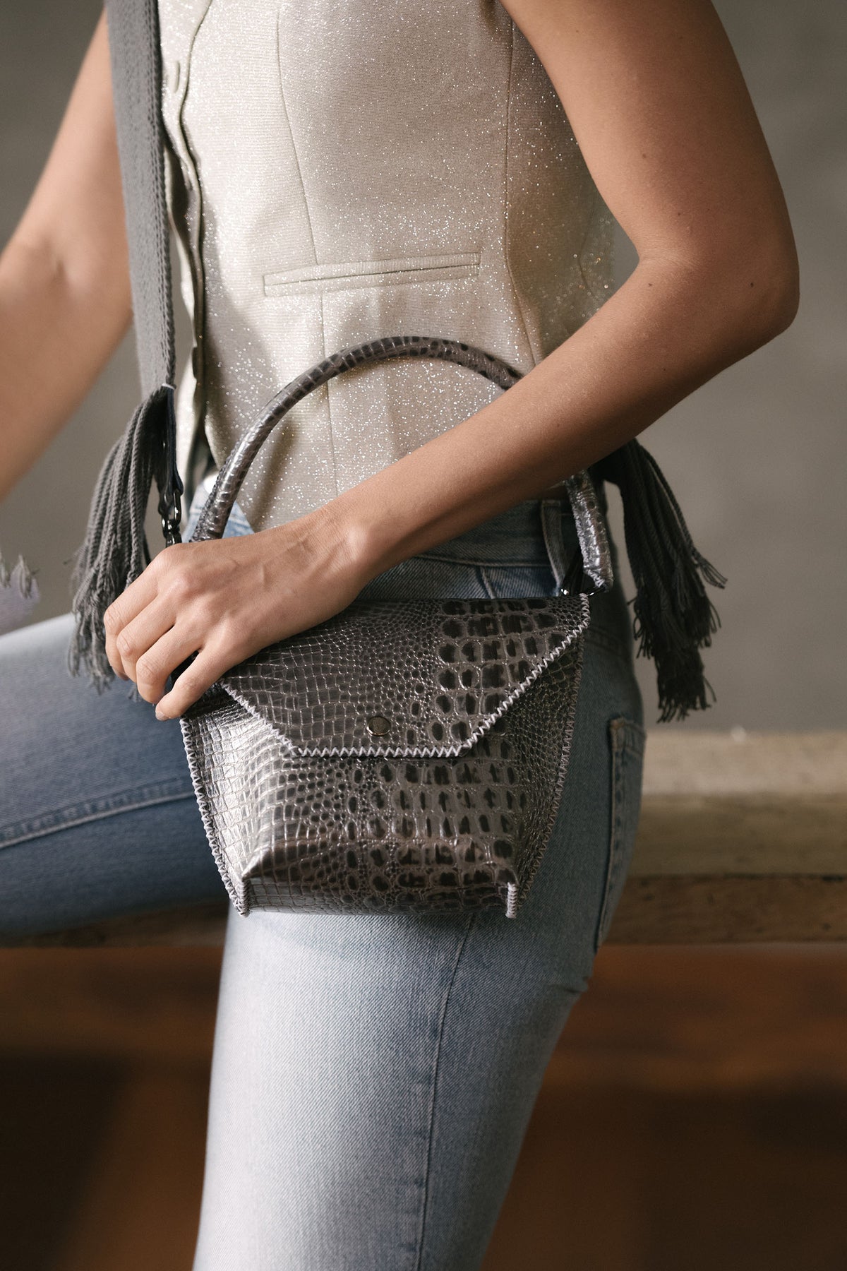X-Small Tote Bag, Dual Strap model with a short beaded strap plus a long hand knitted crossbody-shoulder strap, premium cowhide...