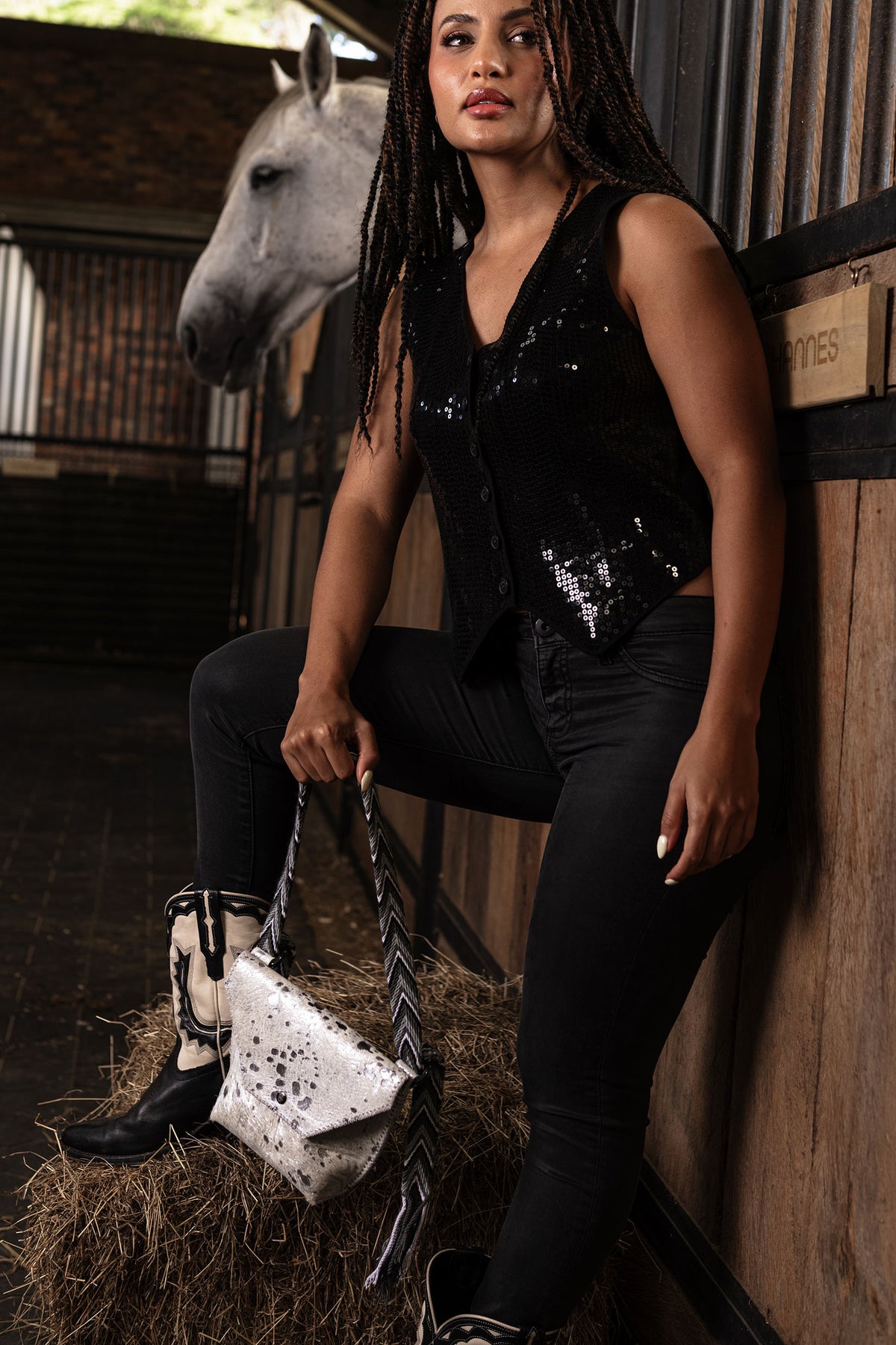 X-Small Tote Bag, Dual Strap model with a short beaded strap plus a long hand knitted crossbody-shoulder strap, premium cowhide...